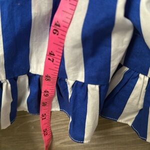 Features smocked square neckline, sleeveless, tiered construction with ruffle trims, back keyhole with tie closure, striped print, and maxi length. Style B1049. 97% Cotton, 3% Spandex. Excellent condition