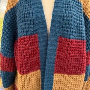 Chunky knit cardigan with bold color blocks. Features deep blue, rich red, and warm tan hues. Perfect for layering. I cut the neck tag out