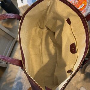 Chic Tory Burch satchel in dark Merlot red leather. Features top handles and a detachable strap. Perfect for versatile styling.