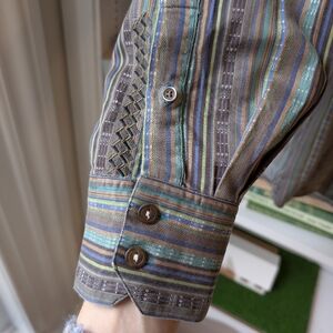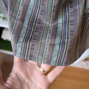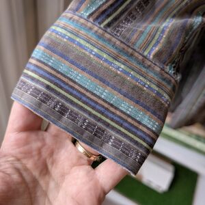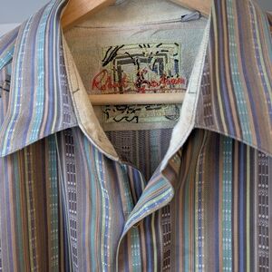 Original Robert Graham men's striped button-up shirt with embroidered details, including the classic embroidered saying "knowledge, wisdom, truth". The fabrics are cotton and silk. The top fabric feels so silky. Features a mix of brown, blue, gray, orange and yellow stripes. Excellent condition, size XL.