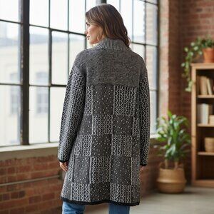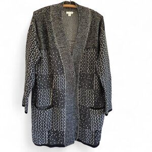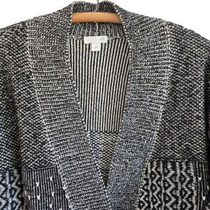 j jill cardigan, cotton blend sweater, long open cardigan, women's geometric sweater, patchwork cardigan, casual knitwear, black white sweater, large sweater, women's longline cardigan, midweight sweater, soft knit cardigan, j jill clothing, cozy cardigan