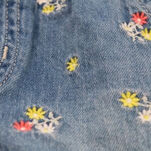 Preowned, gently worn, no flaws or stains. Medium indigo wash denim with colorful allover floral embroidery. Pull-on style with elastic waistband for easy, comfortable fit. Features front slant pockets and back patch pockets. Made with durable, non-stretch cotton blend, part of GAP’s Washwell program with recycled materials.