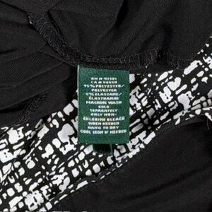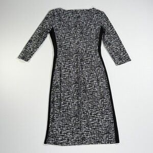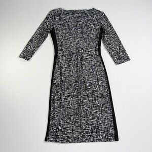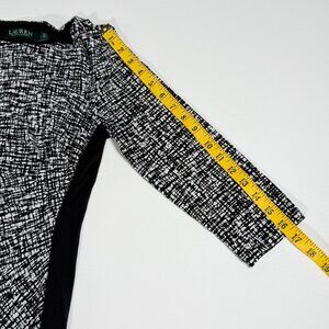 Ideal for the busy woman! This stylish black and white pull-on dress features 3/4 sleeves and color block sides by Ralph Lauren. It offers a perfect blend of professionalism and comfort.