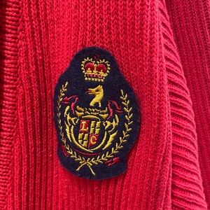 Vintage Liz Sport red cotton cardigan with an embroidered crest emblem.