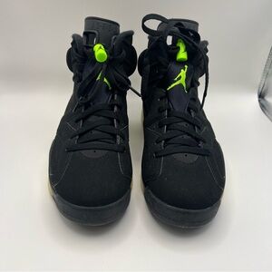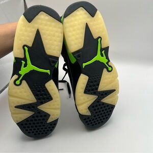 This pair features a black nubuck upper with pops of neon green on the tongue and pull tab while an embroidered Jumpman logo appears on the sneaker's back heel.