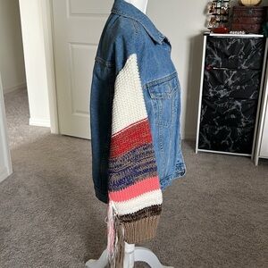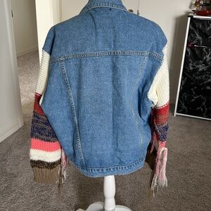 Stylish blue denim jacket. Features multicolor knit sleeves. Perfect for casual wear.