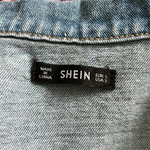 SHEIN Blue Denim Jacket with Multicolor Knit Sleeves