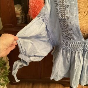 Blue cotton dotted Swiss, deep Vneck, beautiful lace, puff sleeves with tie, worn, good condition, bust 40” and 22” long.