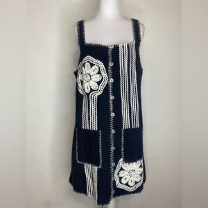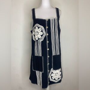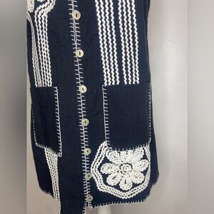 Features: Soft cotton fabrication, square-neckline, button-front closures, embroidered detail throughout, oversized patch-pockets, lined