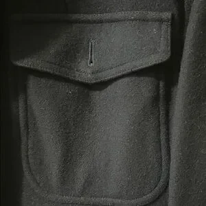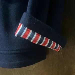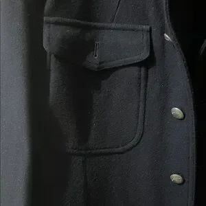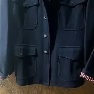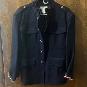 Dark blue utility jacket with metallic buttons. Includes flap pockets and shoulder details. Elegant and practical. Really nice piece. Kept in plastic and like new condition for its age!