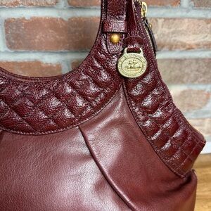 Own a piece of everyday luxury with this stunning Authentic Brahmin Elisa Handbag! This popular shoulder bag is crafted from rich, genuine leather in a deep Burgundy/Bordeaux color, featuring a sophisticated combination of smooth leather and a quilted texture. The unique, pleated hobo silhouette is a timeless classic from Brahmin.