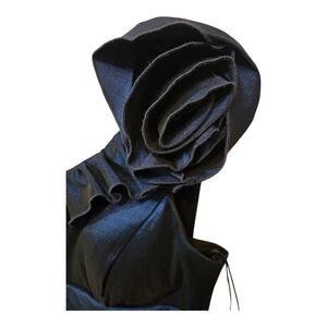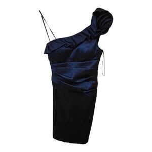 Size: 6P Step out in style with this elegant one-shoulder navy dress. Perfect for any occasion, this dress features a unique design that stands out. The rich navy color adds a touch of sophistication to your wardrobe. Features: One-shoulder construction with floral detailing • Asymmetric neck • Ruching at the waist • Fit & flare silhouette • Comfy & stretchy scuba fabric • Asymmetrical •Build in Bra Cups
