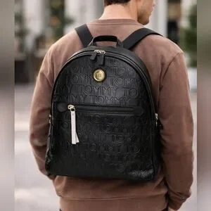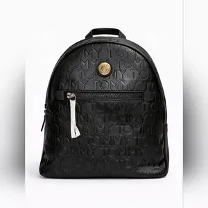 Tommy Hilfiger Black Embossed Backpack | Gold Logo | Zipper Closure | NWT Medium