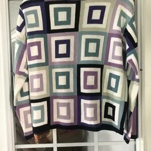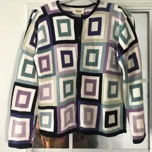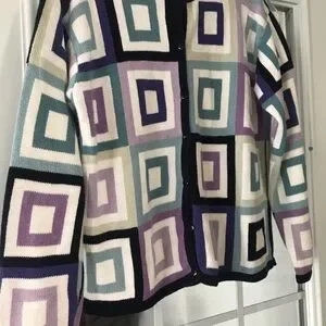 Stylish cardigan with a geometric square pattern. Features shades of purple, blue, and cream.