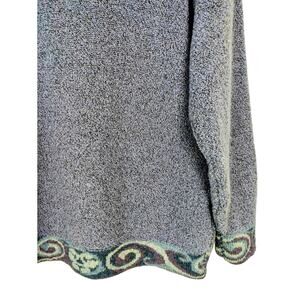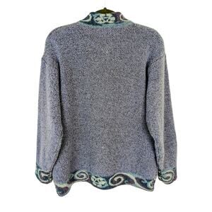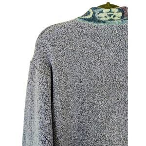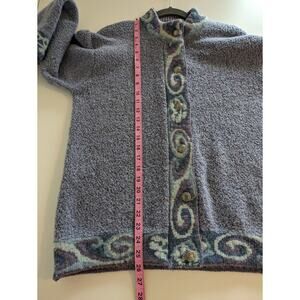 Features and description: cardigan sweater; oversized; button front; fuzzy textured knit Merino wool and cashmere blend; floral patterned trim; purple and blue; made in Scotland