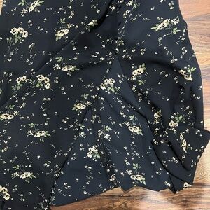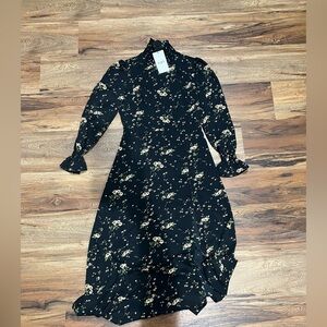 This chic black dress features a delicate floral design, perfect for any occasion. The long sleeves add elegance and style. This dress is absolutely beautiful if you need me to measure I can it has a slit and beautiful buttons see pictures. New with tags. Very elegant for any occasion you can dress it up or down!
