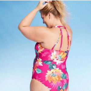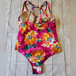 Kona Sol Pink Floral tropical One Piece swimsuit with Strappy Back Flattering
