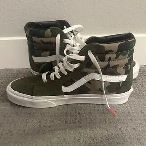 Stylish high-top sneakers with a green and camouflage pattern. Features white laces and signature Vans stripe.