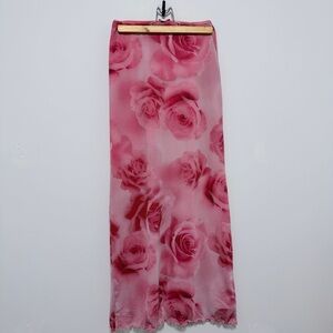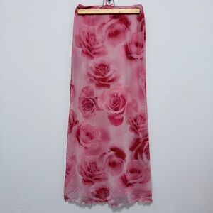 Lined pink floral maxi skirt with an allover rose print. Lightweight, flowy fabric with a soft, semi-transparent finish and a delicate lettuce-edge hem. Pull-on elastic waistband for an easy, comfortable fit. Romantic and feminine—perfect for dressing up with heels or styling casually with a knit or tee.