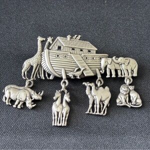 Charming silver brooch featuring Noah's Ark and animal charms. Perfect accessory for any outfit.