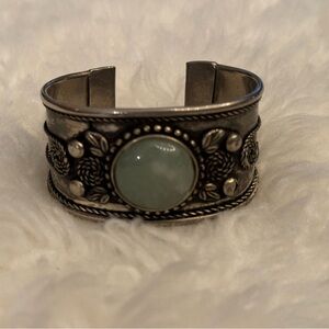 Unique and Cool Vintage hand tooled Cuff Bracelet with pale Greenish Stone. Stone appears to be Chalcedony or possibly Jade