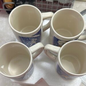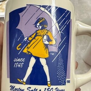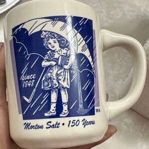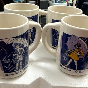 Charming Avon mugs featuring Morton Salt's 150th anniversary design. Classic blue and white colors. Perfect for collectors and daily use. This is a set of four Morton Salt 150th Anniversary commemorative mugs featuring the iconic Umbrella Girl logo from different years.