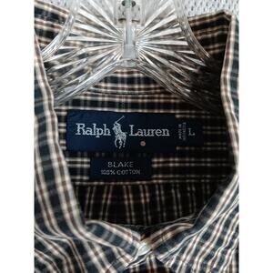Elevate your preppy style with this vintage Ralph Lauren Blake shirt. Featuring a classic brown and navy check pattern, this button-down shirt is perfect for a smart-casual look. Made from high-quality materials, it offers both comfort and durability.