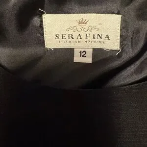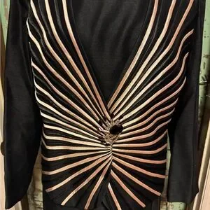This elegant women's dress features a striking black and gold design, perfect for any formal occasion. The sophisticated pattern adds a touch of class and style. Beautiful 3 piece Skirt top and jacket. Gorgeous vintage
