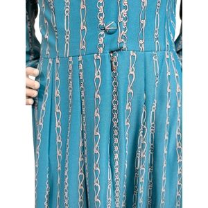 Striking vintage dress featuring a bold graphic chain-link print in a vibrant turquoise blue. Likely dating to the late 1960s to early 1970s, this piece blends mod-era structure with early bohemian influence.