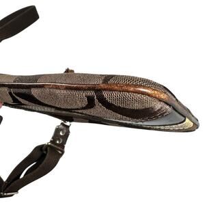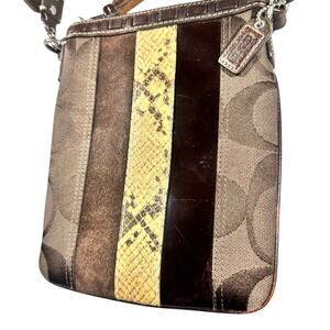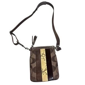 Classic Coach Hampton crossbody featuring the iconic brown signature “C” canvas with a stylish vertical stripe detail in mixed materials, including suede, smooth leather, and snakeskin-embossed leather. Finished with a zip-top closure and a leather tassel pull for a polished touch. Adjustable brown webbed strap allows for comfortable crossbody or shoulder wear. Compact yet functional—perfect for everyday essentials.