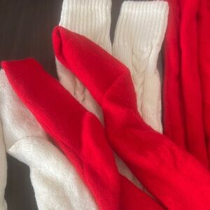 4 Pair Thigh High Cable Knit Socks - White, Red, Black and Gray. All have been warm a few times. No rips or holes of any kind.