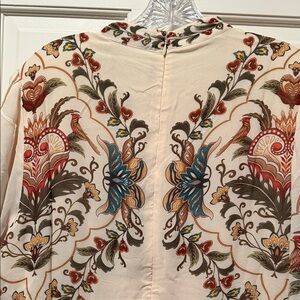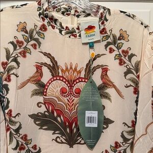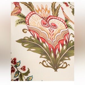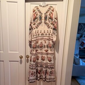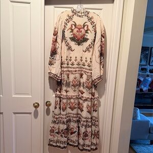 The Cream Majestic Hearts Maxi Dress dances softly in cream tones, adorned with intricate heart motifs and nature-inspired prints that weave warmth and charm. The high neckline frames the face elegantly, while billowy, voluminous sleeves add a playful, airy silhouette. Subtle ruffle trims create gentle movement along the tiers of the skirt, embracing a graceful, flowing shape. This dress invites a serene, spirited presence wherever it goes.