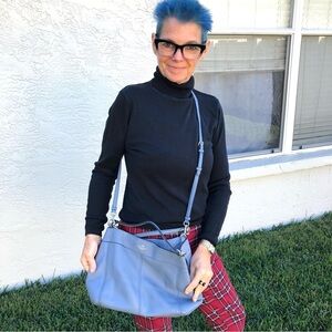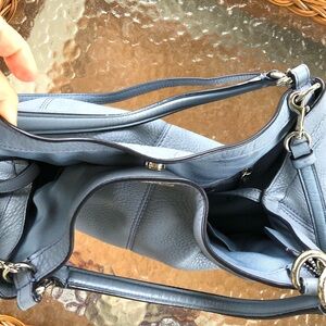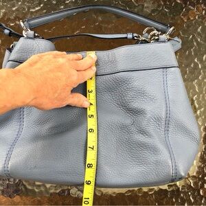 Coach Lexy Pebbled Leather Convertible Bag F23537 Converts to Crossbody with Detachable and Adjustable Crossbody Strap, Wear as a Handbag or Shoulder Bag with double handles, Coach Logo is present on the front, and engraved in the silver tone hardware, Top Clip closure , Magnetic Snap closure, Expandable sides, Interior has one zip pocket and one open slip pocket, The leather is super soft, Beautiful Light blue color, A really comfortable bag to wear, Hang tag with branding, Dated, August 2017, In good used condition.