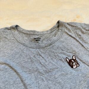 Cute embroidered bulldog tee from Sunday Best. Color is solid heather grey. No stains or anything - shadows casted when taking pics make the tee look splotchy.