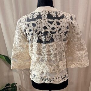 Chic beige blouse with intricate lace detail by Current Air. Ideal for casual or formal wear. Soft and elegant. Dress up or down!