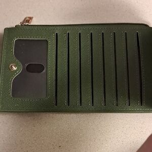 Sleek green wallet by Travelambo. Features a secure snap closure and zippered compartment. Rfid blocking to protect credit cards while traveling. used one time. used good condition.