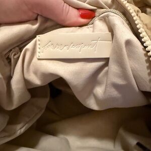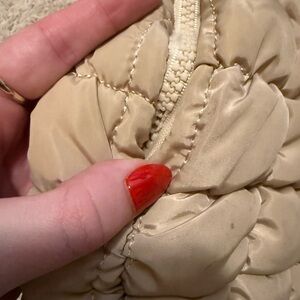 This elegant cream quilted bag is perfect for any occasion. Its stylish design and neutral color make it a versatile addition to your wardrobe. One of the side zippers is broken, but you can’t tell unless you unzip it.