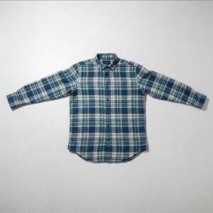 This authentic J. Crew Mercantile button-down shirt is a timeless piece for any wardrobe. This long-sleeve shirt features a classic plaid pattern in a mix of blues, greens, and tans, giving it a polished yet approachable look.
