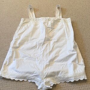 This chic white romper features elegant lace trim, offering a stylish and versatile look for any occasion.