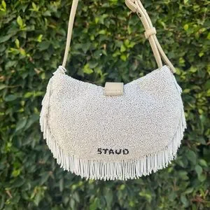 This Alana shoulder bag from Staud is designed with shimmering glass beads, graceful fringe trim, and an adjustable strap.