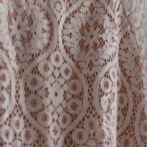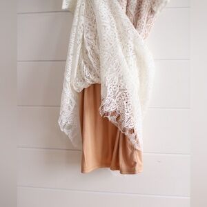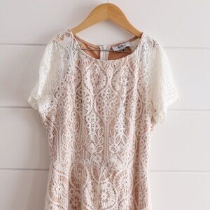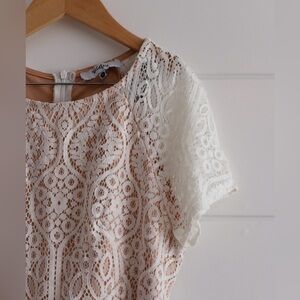 A beautiful white lace dress with a nude lining. Short cap sleeves and a high/low hem line. This dress has a back zip closure.