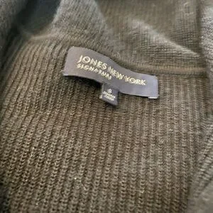This Jones New York women's jacket in size small is a stylish and versatile addition to any wardrobe. The black jacket features gold snap closures, a high neck, and pockets for added convenience. Made from cotton twill fabric, this mid-length jacket is perfect for casual occasions in the winter, fall, or spring. The classic fit and long sleeves make it a timeless piece that can be easily styled for any occasion. Machine washable and with a stretchy design, this jacket combines practicality with a touch of metal-themed style.