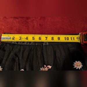 Elegant black A-line skirt. Adorned with vibrant embroidered floral patterns. Really beautiful and fun to wear. Waist is about 12" flat, and the length is 25" for the underskirt and 27" with the mesh overskirt. It says US4 but fits more like a 2 at most I think.
