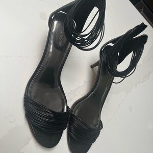 The Coach "Manya" kitten heel is a sleek, elegant leather sandal featuring a low, sculpted kitten heel with a strappy design. These have been worn a few times and are in great shape.