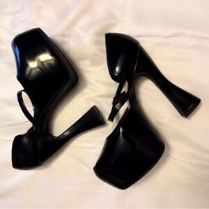 Statement heels with a sculpted platform and Mary Jane strap — bold, glossy, and perfect for nights out or editorial looks. These instantly elevate any outfit. Some light wear on one toe (shown in photos), otherwise great condition!