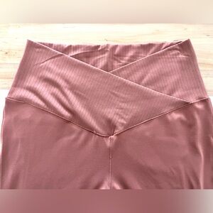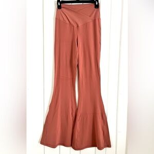 Aerie Offline Real Me Super Flare with Rib leggings. Color is light burnt orange. Fabric is 88% Nylon, 12% Elastane. Size Large. Ideal for athleisure or everyday casual cuteness! Great direction.
