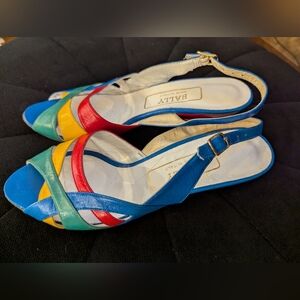 Vibrant and fun, vintage 80s multicolor leather, peep toe, sling back, low heel pumps. Colorblock style classic of the 80s. Made in Italy.