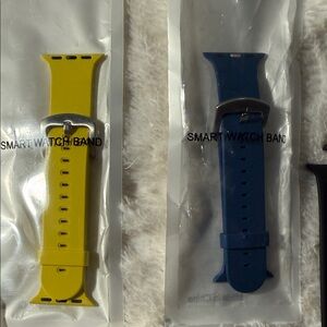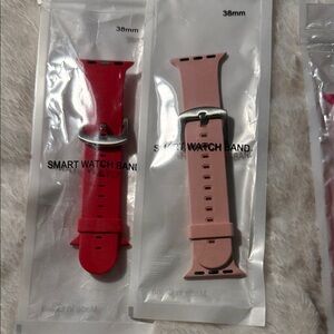 Vibrant watch bands in various colors. 11 watch bands. Perfect for any style. Easy to swap and comfortable to wear. The brown one is faux leather. The other ones are rubber and colors are-purple, yellow, blue, red, pink, light pink and white. There is a black set with a s/m and m/l band. There is a faux leather with adjustable stainless steel band. All are new. Size is 38mm.