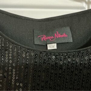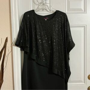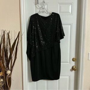 This appears to be a Hanna Nikole Black Sleeveless Cape Sequin Overlay Bodycon Pencil Dress, size 16W. The dress is made from polyester and elastane, with a sequin or chiffon overlay for a flattering fit and elegant look.