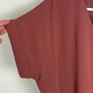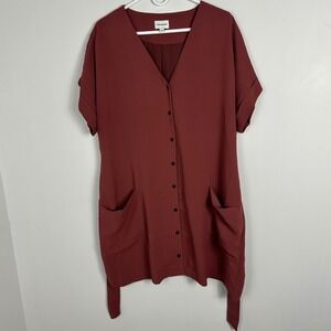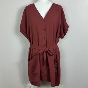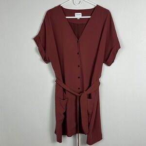Frank & Oak Rusty Red Short Sleeve Belted Button Down Dress in Women's Size XL. V-neckline. Made in China. Lined. Polyester. Style 2510169. Great pre-owned condition. Please review all photos.